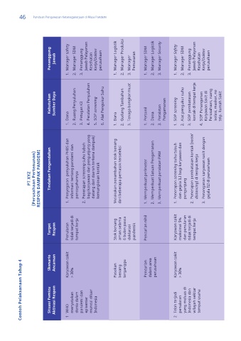 PT XYZ (Perusahaan Pertenunan) RESPON DAMPAK PANDEMI Tindakan Pengendalian 1. Penyegaran penyuluhan PHBS dan informasi tentang pandemi dan pencegahannya 2. Penerapan screening suhu tubuh bagi karyawan dan pengunjung yang datang dari daerah terkena dampak/ kemungkinan kontak Melakukan penambahan stok benang dari beberapa pemasok terseleksi 1. Memperkuat perimeter 2. Memperkuat Satuan Pengamanan 3. Memperkuat peralatan PAM 1. Penerapa